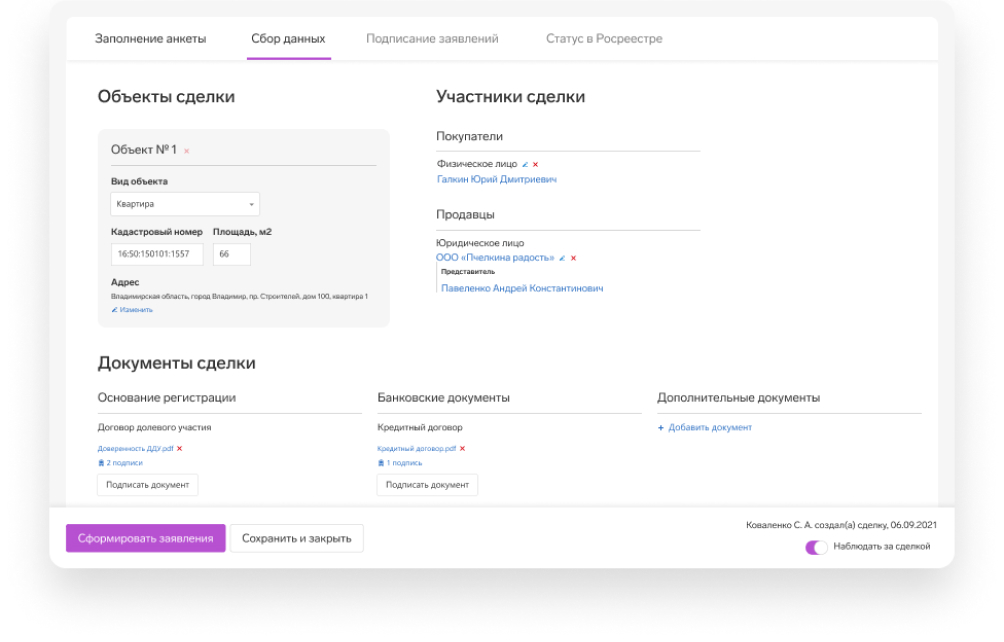 Достаточно заполнить информацию и отправить запрос в Росреестр. Сервис будет показывать статус сделки и позволит выпустить электронную подпись на всех участников.